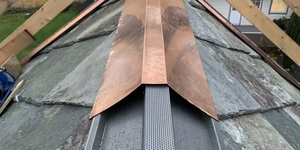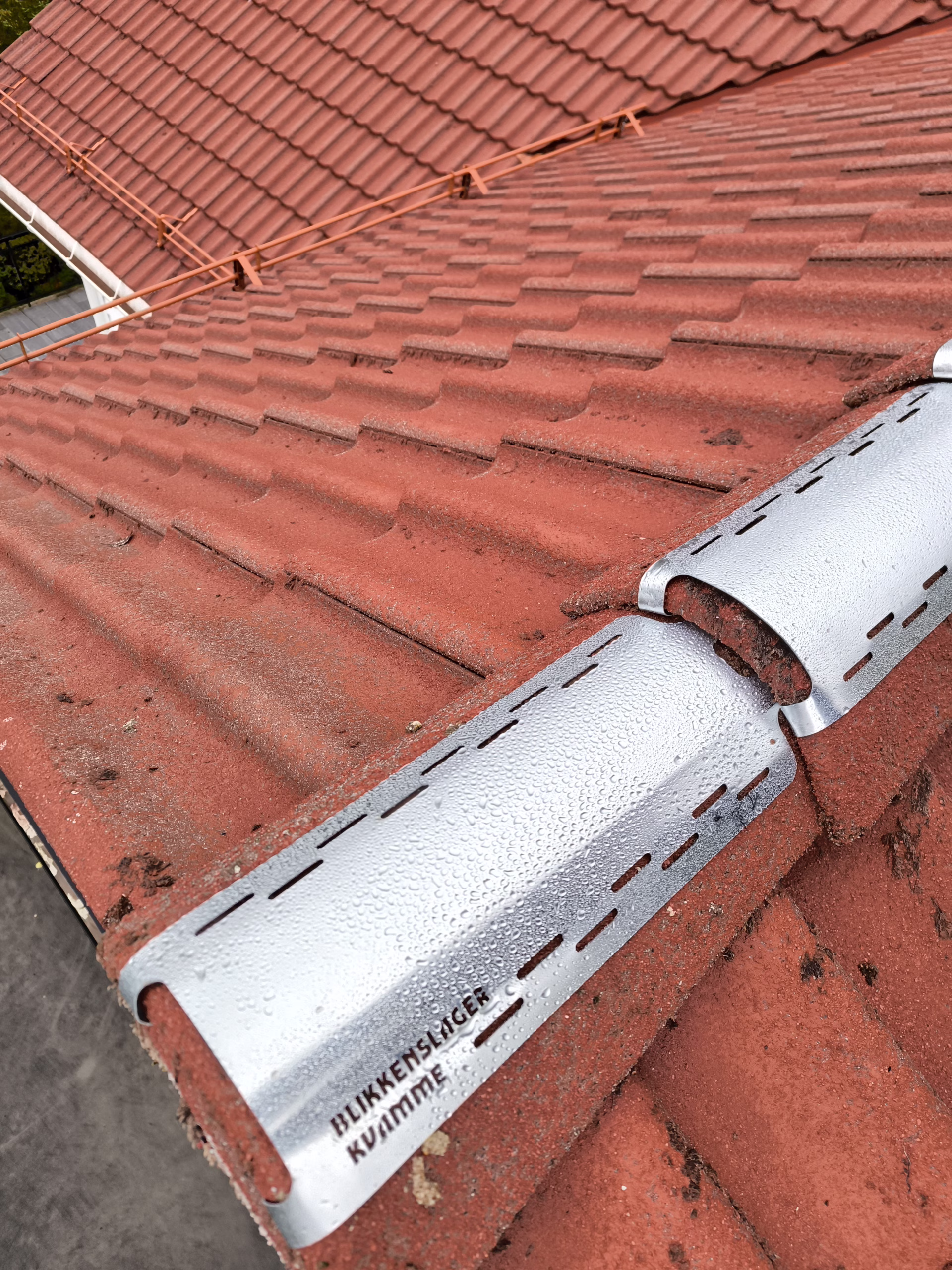 Mønebeslag produsert i naturmaterialet Sink. Hindrer vekst av mose på tak og takstein.