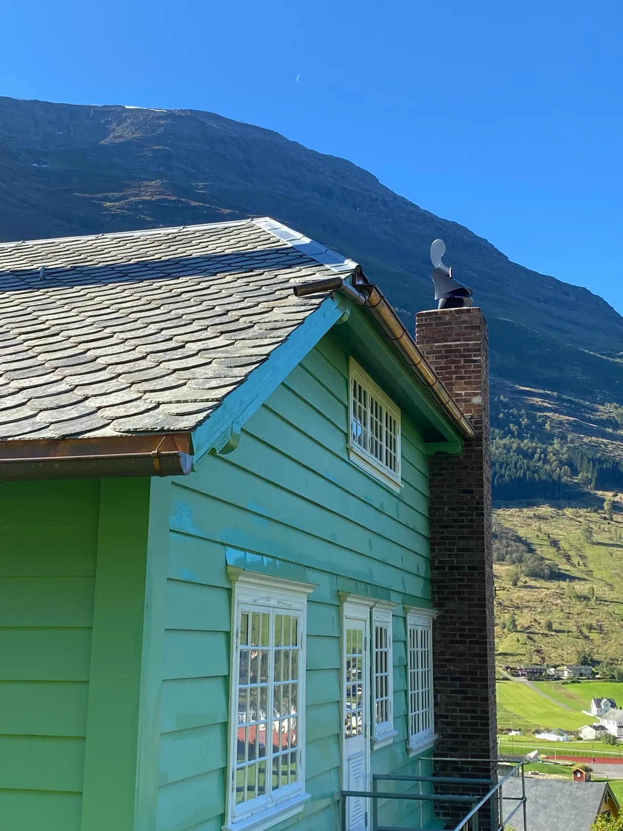 Bildet over viser arbeid utført i forbindelse med takfornying på Frendehall ungdomshus på Nordsida i Stryn kommune. Vi leverte og monterte pipehatt og beslag, og takrenner ble også oppgradert.