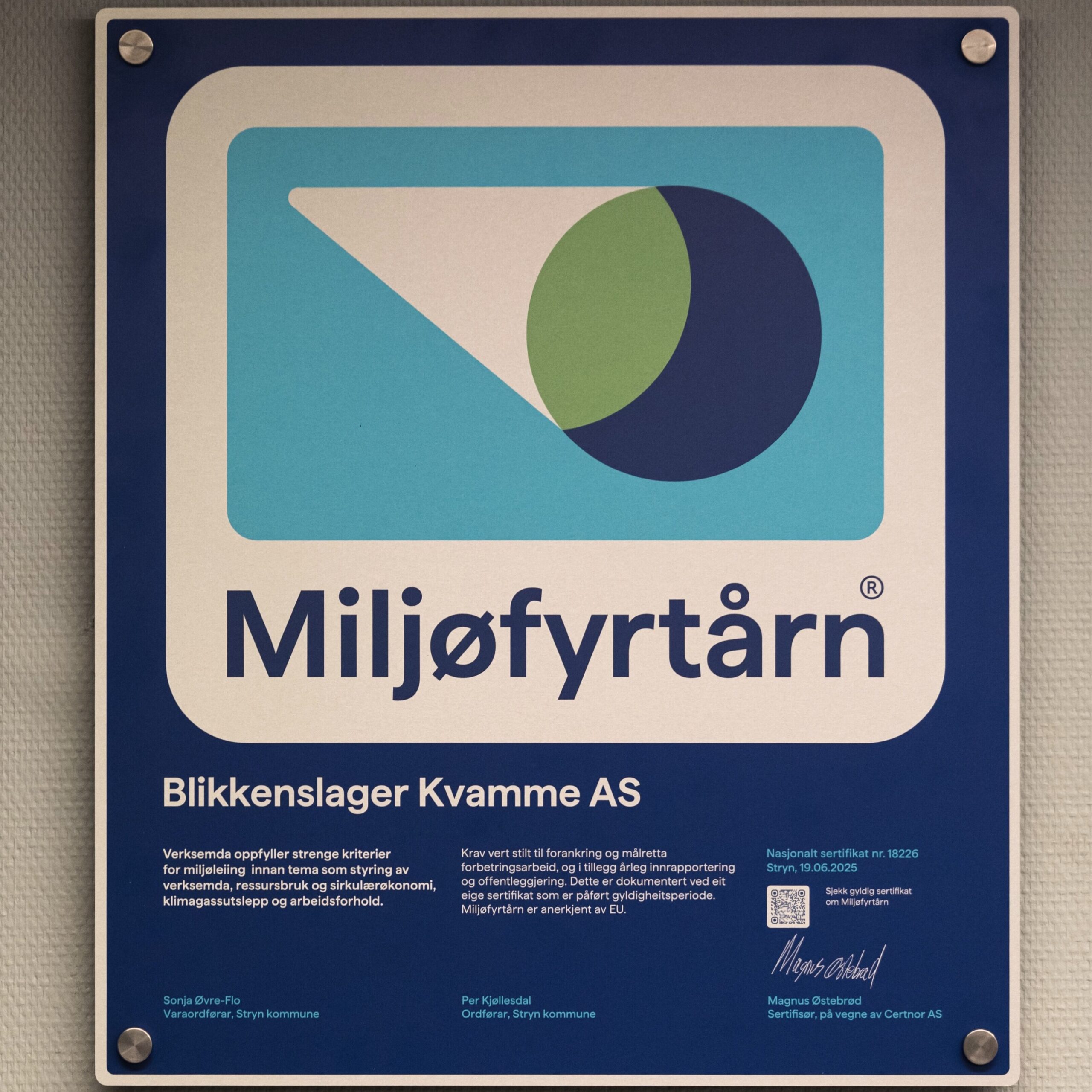 Blikkenslager Kvamme er sertifisert som Miljøfyrtårn, en anerkjent norsk miljøsertifisering som dokumenterer at vi arbeider systematisk med klima, miljø og bærekraft i vår virksomhet.