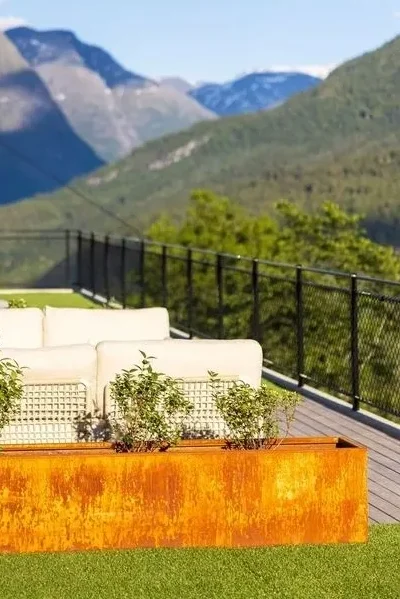 Plantekassene på bildet er laget i cortenstål, et materiale som får den karakteristiske rustfargen allerede etter det første regnskyllet.